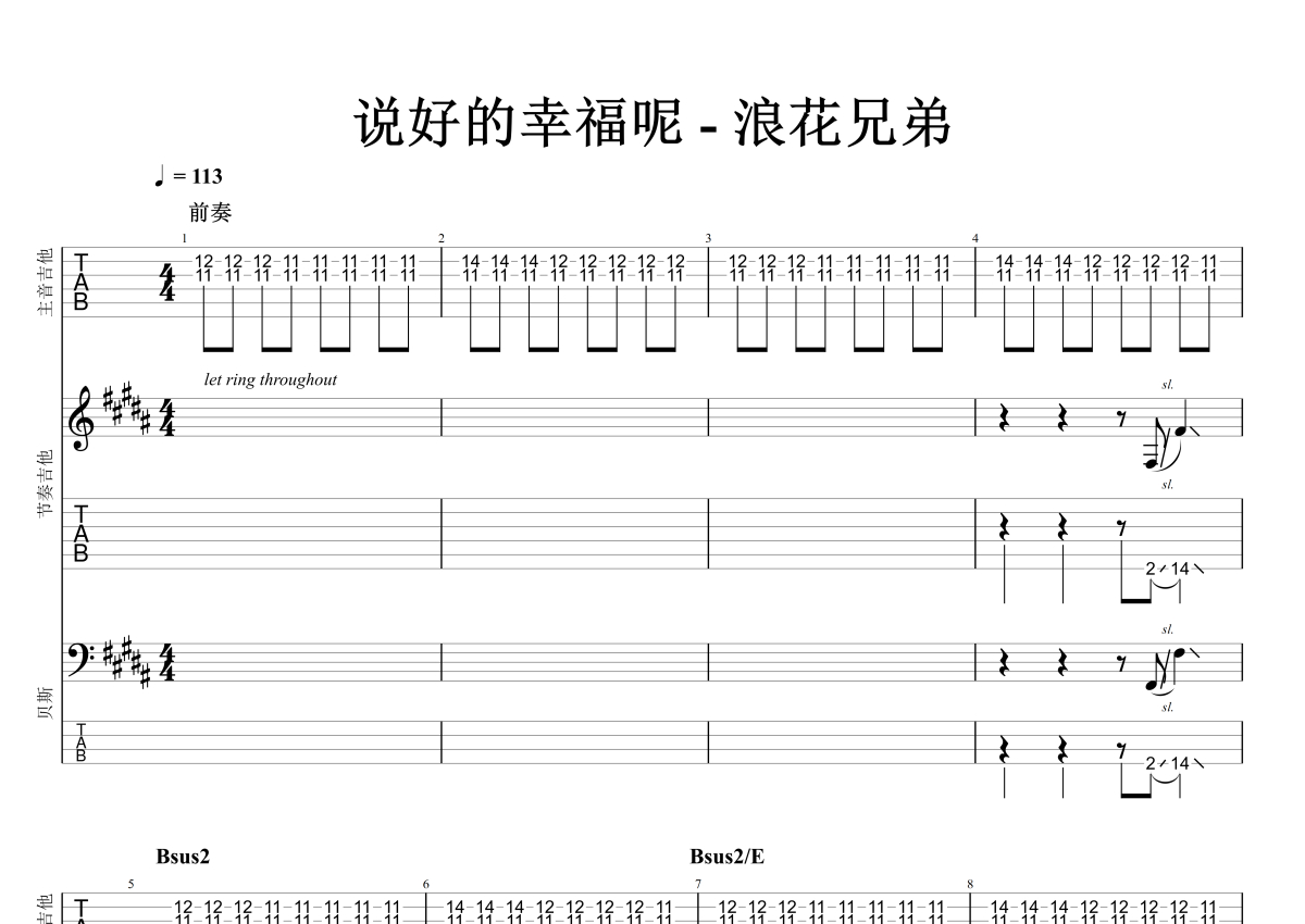 《说好的幸福呢》是周杰伦 浪花兄弟演唱的一首歌曲,石头音乐原版记谱,拍号为4/4拍,歌曲速度为每分钟113拍,歌曲原调为B调,但由于原调指法比较难,为了方便弹奏,本吉他谱采用的是B调指法编配,演奏时不需要使用变调夹即为原调,这份吉他谱共有十四张高清图谱,图谱由 @石头音乐 编配上传,图谱使用六线谱编配,曲谱配备了相关的音频提供试听,使用这份说好的幸福呢吉他谱,可以让你更加方便地掌握这首歌曲的演奏技巧,快来尝试吧。