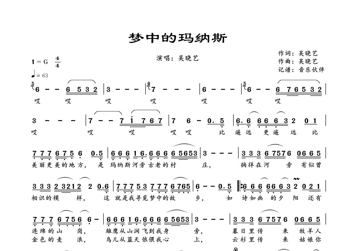 《梦中的玛纳斯》是吴晓艺演唱的一首歌曲,拍号为4/4拍,歌曲速度为每分钟63拍,这份简谱共有一张高清图谱,图谱由 @音乐伙伴 编配上传。