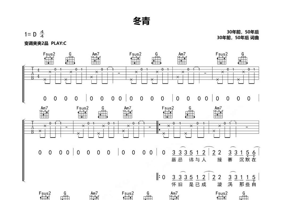 30年前,50年后《冬青》吉他谱 - C调弹唱六线谱
