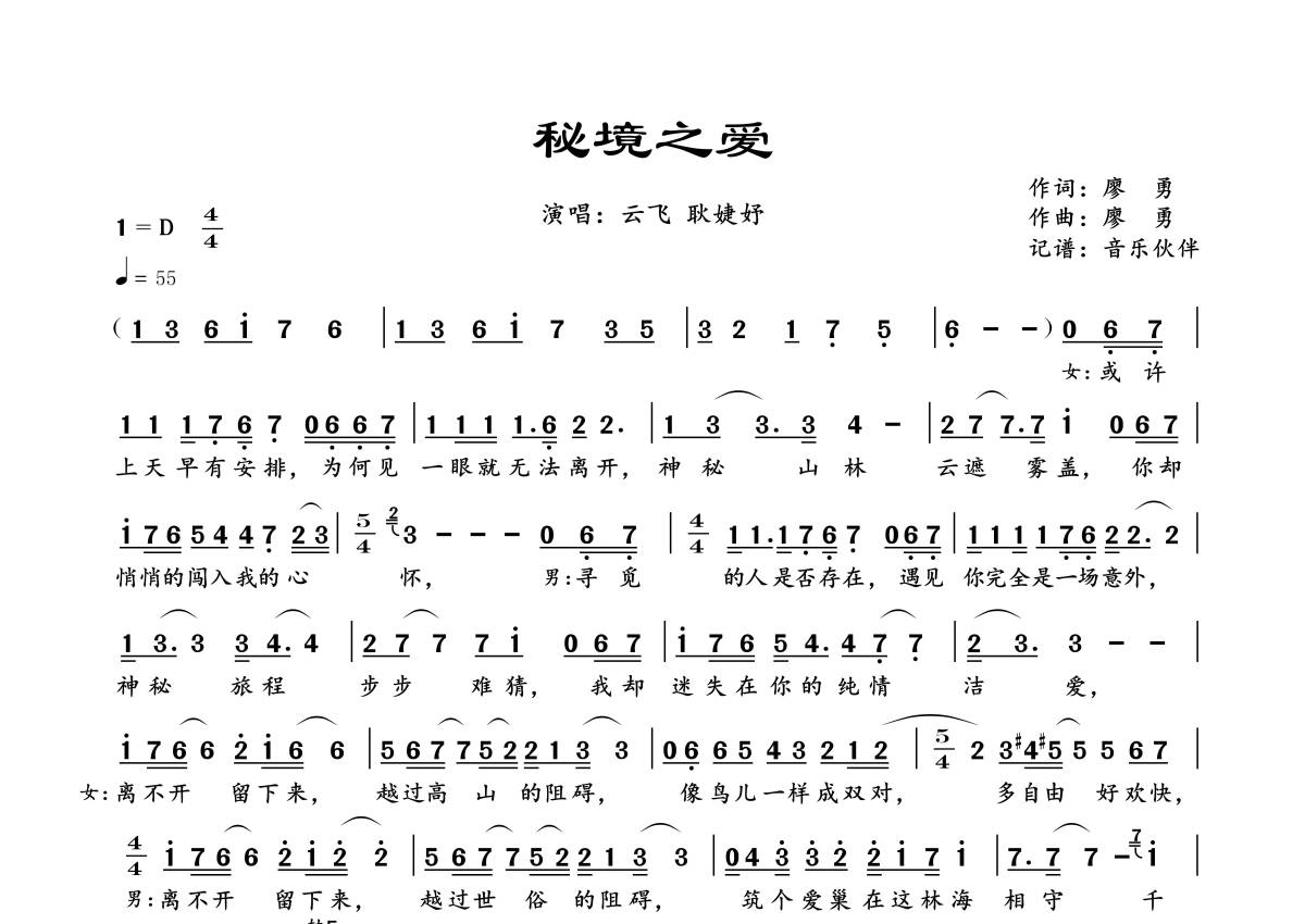 《秘境之爱》是云飞/耿婕妤演唱的一首歌曲,拍号为4/4拍,歌曲速度为每分钟55拍,这份简谱共有一张高清图谱,图谱由 @音乐伙伴 编配上传。