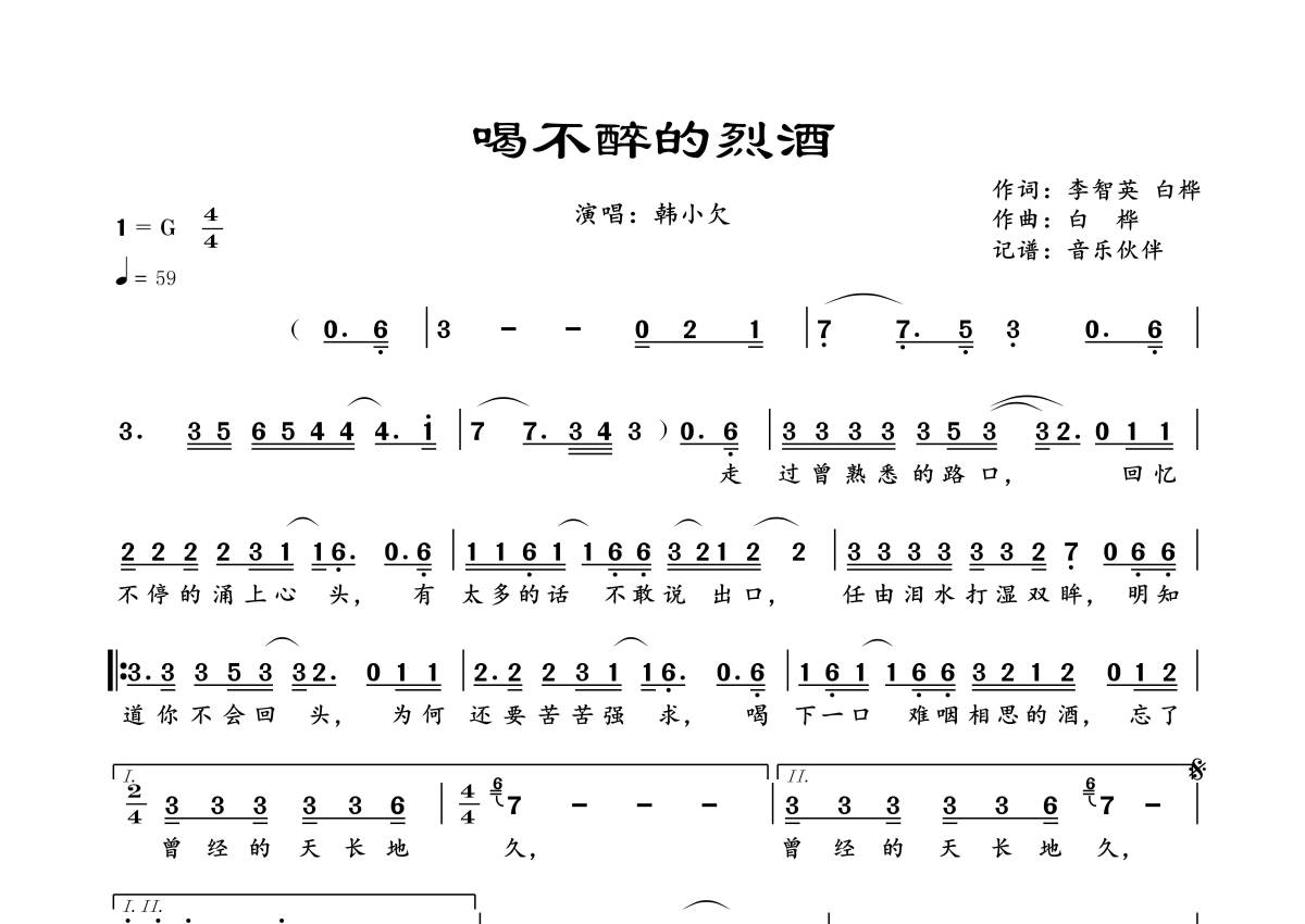 《喝不醉的烈酒》是韩小欠演唱的一首歌曲,拍号为4/4拍,歌曲速度为每分钟59拍,这份简谱共有一张高清图谱,图谱由 @音乐伙伴 编配上传。