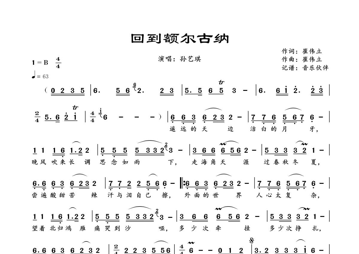 《回到额尔古纳》是孙艺琪演唱的一首歌曲,拍号为4/4拍,歌曲速度为每分钟63拍,这份简谱共有一张高清图谱,图谱由 @音乐伙伴 编配上传。
