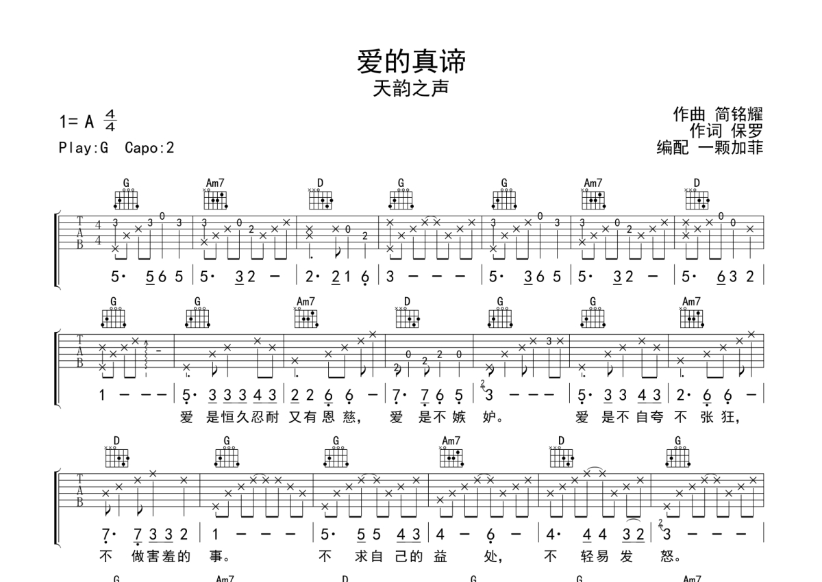《爱的真谛》是天韵之声演唱的一首歌曲,拍号为4/4拍,歌曲原调为A调,但由于原调指法比较难,为了方便弹奏,本吉他谱采用的是G调指法编配,变调夹2品弹奏即为原调,当然也可以根据自己的音域改变变调夹位置,或者通过改变和弦调性,以方便自己弹奏,这份吉他谱共有一张高清图谱,图谱由 @一颗加菲 编配上传,图谱使用六线谱编配,包含吉他和弦指法、简谱以及歌词部分,曲谱配备了相关的音频提供试听,使用这份爱的真谛吉他谱,可以让你更加方便地掌握这首歌曲的弹唱技巧,快来尝试吧。