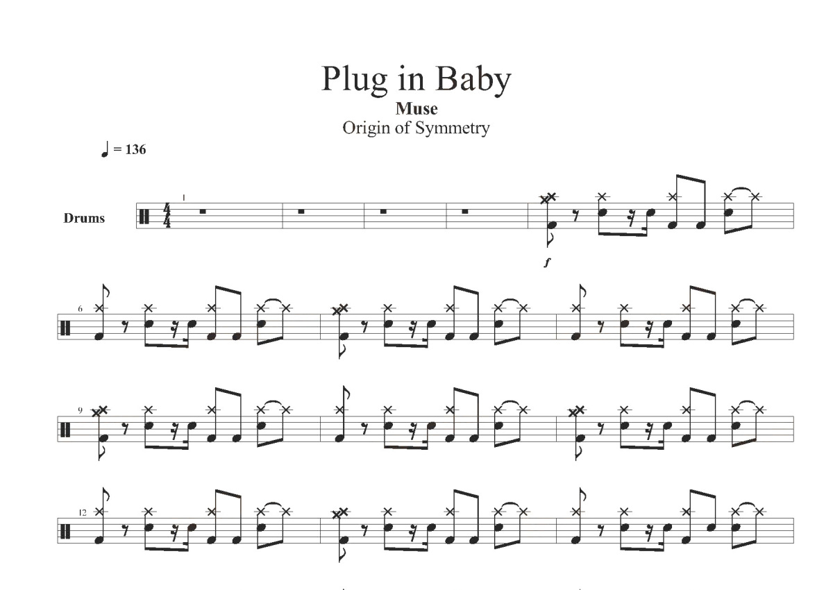 《Plug in baby》是Muse演唱的一首歌曲,这份鼓谱共有四张高清图谱,图谱由 @打鼓谱 编配上传,图谱使用五线谱编配,使用这份Plug in baby架子鼓谱,你将能够轻松地敲打出这首Muse的Plug in baby,快来尝试吧。“ Plug In Baby ”是英国摇滚乐队Muse的一首歌。它于2001年3月5日作为乐队第二张录音室专辑《Origin of Symmetry(2001)》的主打单曲发行。
