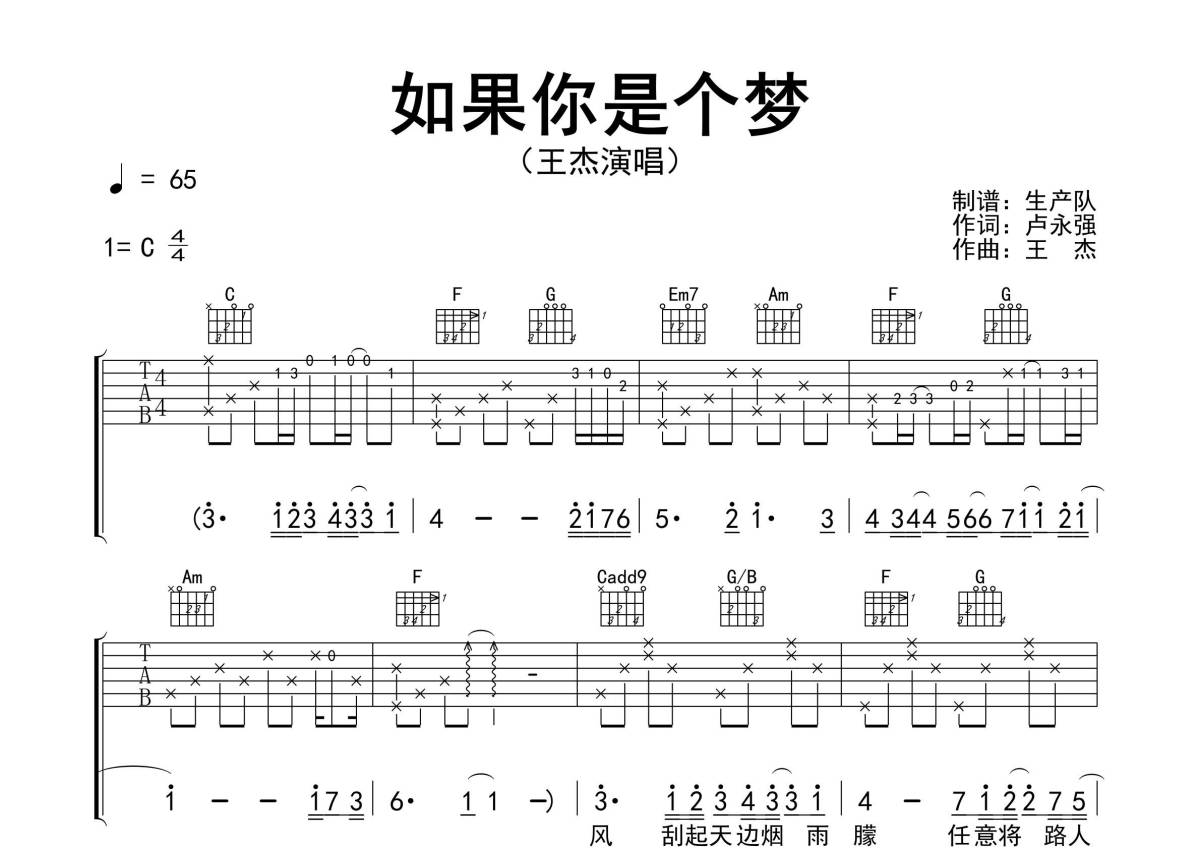 《如果你是个梦》是王杰演唱的一首歌曲,精编完美版,拍号为4/4拍,歌曲速度为每分钟65拍,歌曲原调为C调,本吉他谱采用的是C调指法编配,演奏时不需要使用变调夹即为原调,这份吉他谱共有三张高清图谱,图谱由 @生产队 编配上传,图谱使用六线谱编配,包含吉他和弦指法、简谱以及歌词部分,使用这份如果你是个梦吉他谱,可以让你更加方便地掌握这首歌曲的弹唱技巧,快来尝试吧。《如果你是个梦》是一首由卢永强作词,由王杰作曲并演唱的歌曲,收录在粤语专辑《她》中。本吉他谱根据原版C调指法编配,完整的前奏、间奏、尾奏和SOLO编配,怀旧经典!。