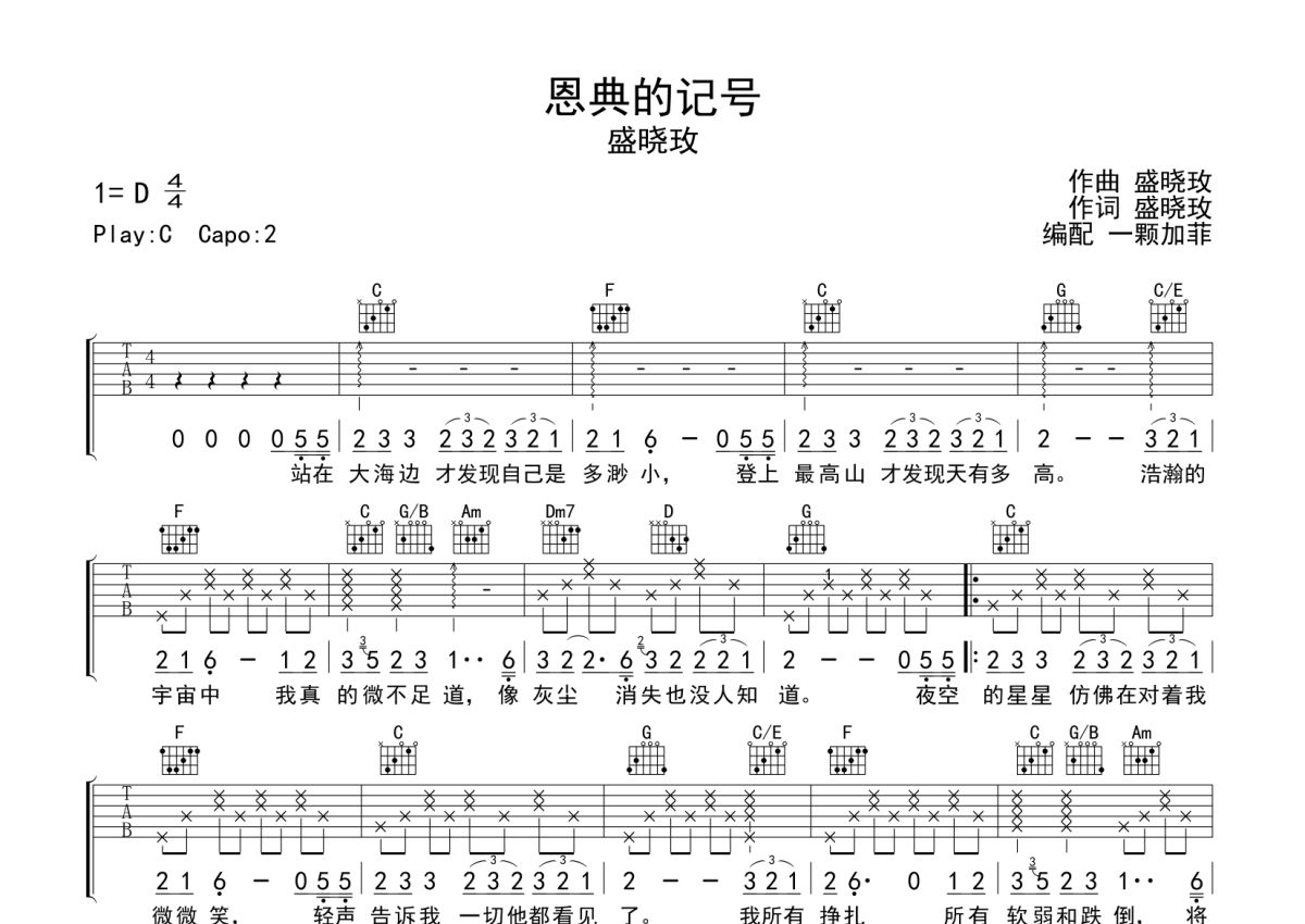 盛晓玫《恩典的记号》吉他谱 - C调弹唱六线谱