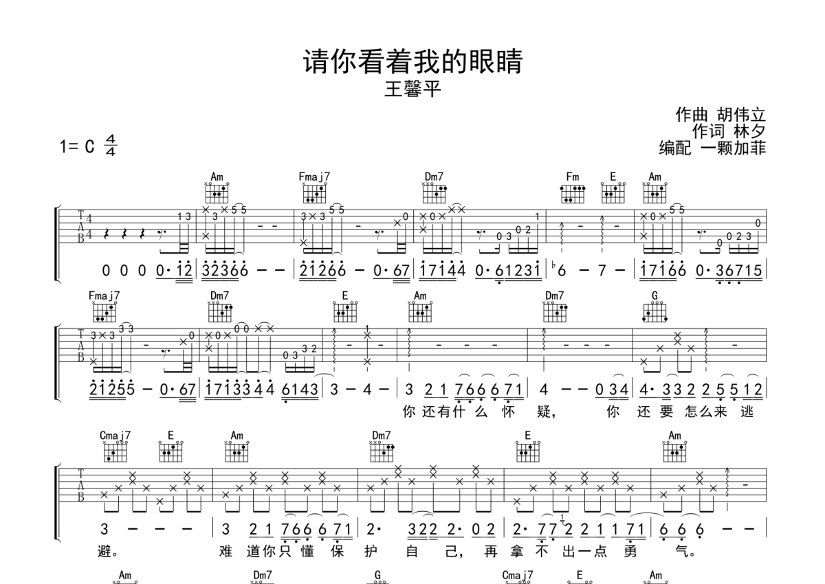 王馨平《请你看着我的眼睛》吉他谱 - C调弹唱六线谱