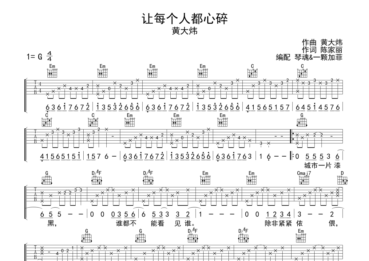 黄大炜《让每个人都心碎》吉他谱 - G调弹唱六线谱