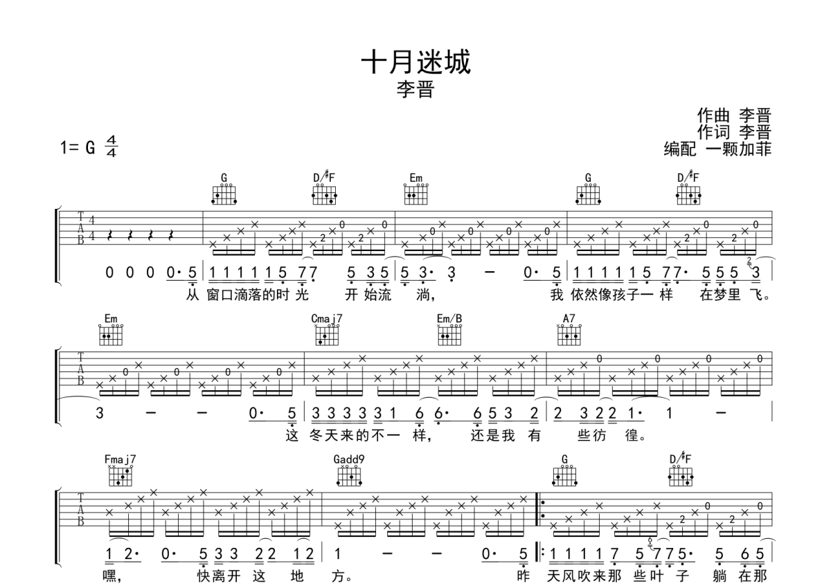 李晋《十月迷城》吉他谱 - G调弹唱六线谱