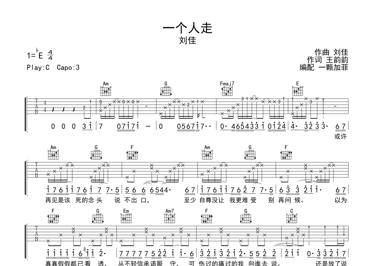 刘佳《一个人走》吉他谱 - C调弹唱六线谱