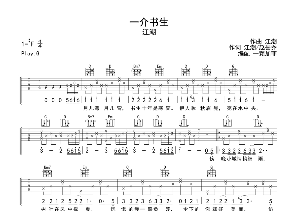 江潮《一介书生》吉他谱 - G调弹唱六线谱