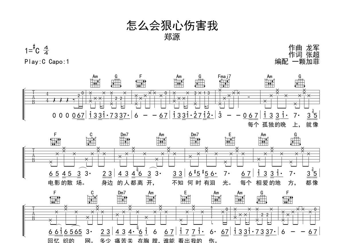 郑源《怎么会狠心伤害我》吉他谱 - C调弹唱六线谱