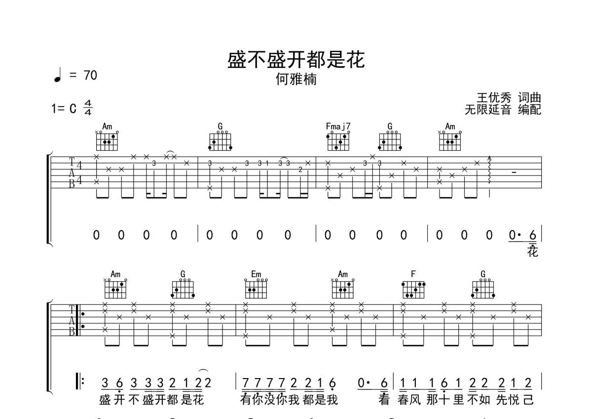 《盛不盛开都是花》是何雅楠演唱的一首歌曲,拍号为4/4拍,歌曲速度为每分钟70拍,歌曲原调为C调,本吉他谱采用的是C调指法编配,演奏时不需要使用变调夹即为原调,这份吉他谱共有两张高清图谱,图谱由 @无限延音 编配上传,图谱使用六线谱编配,包含吉他和弦指法、简谱以及歌词部分,使用这份盛不盛开都是花吉他谱,可以让你更加方便地掌握这首歌曲的弹唱技巧,快来尝试吧。