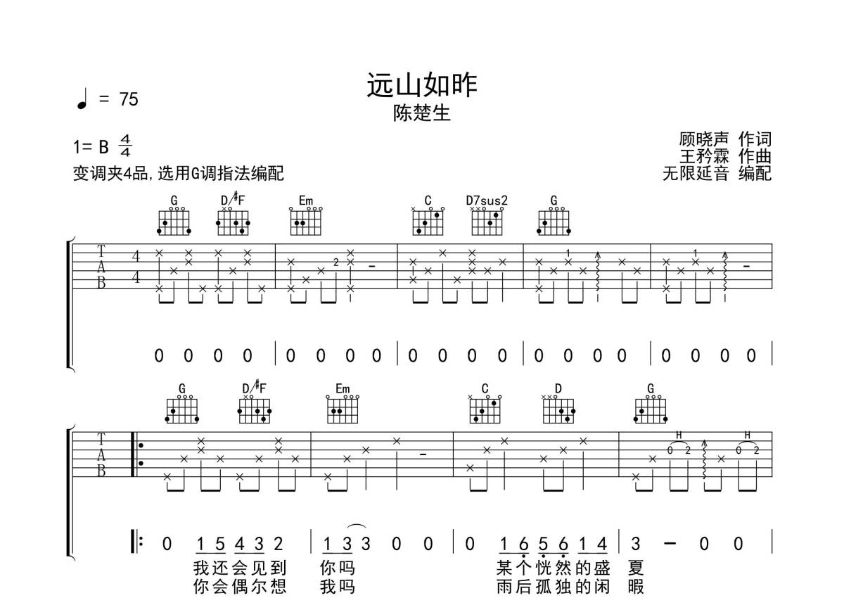 陈楚生《远山如昨》吉他谱 - G调弹唱六线谱