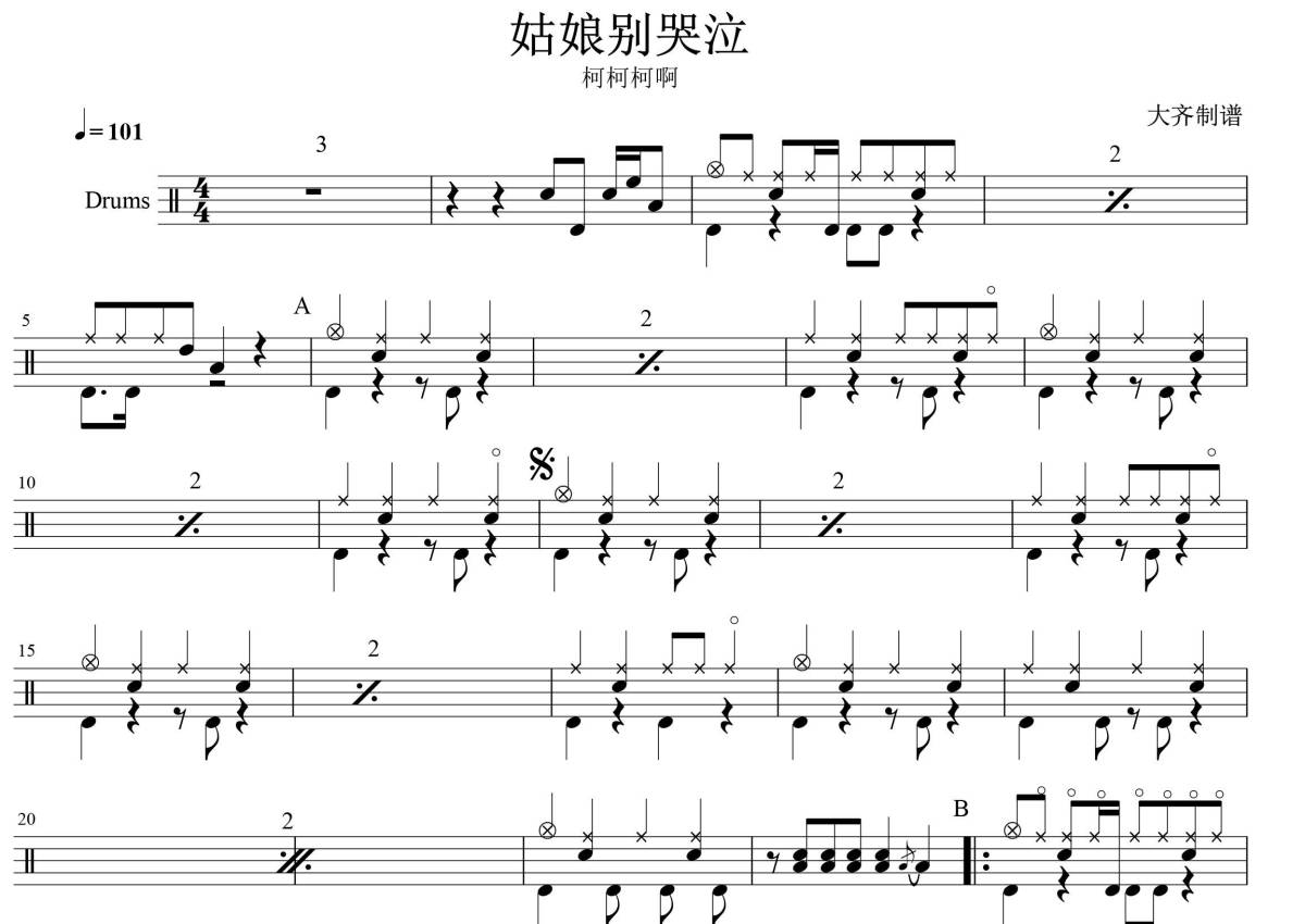 《姑娘别哭泣》是柯柯柯啊演唱的一首歌曲,拍号为4/4拍,歌曲速度为每分钟101拍,这份鼓谱共有一张高清图谱,图谱由 @大齐 编配上传,图谱使用五线谱编配,使用这份姑娘别哭泣架子鼓谱,你将能够轻松地敲打出这首柯柯柯啊的姑娘别哭泣,快来尝试吧。