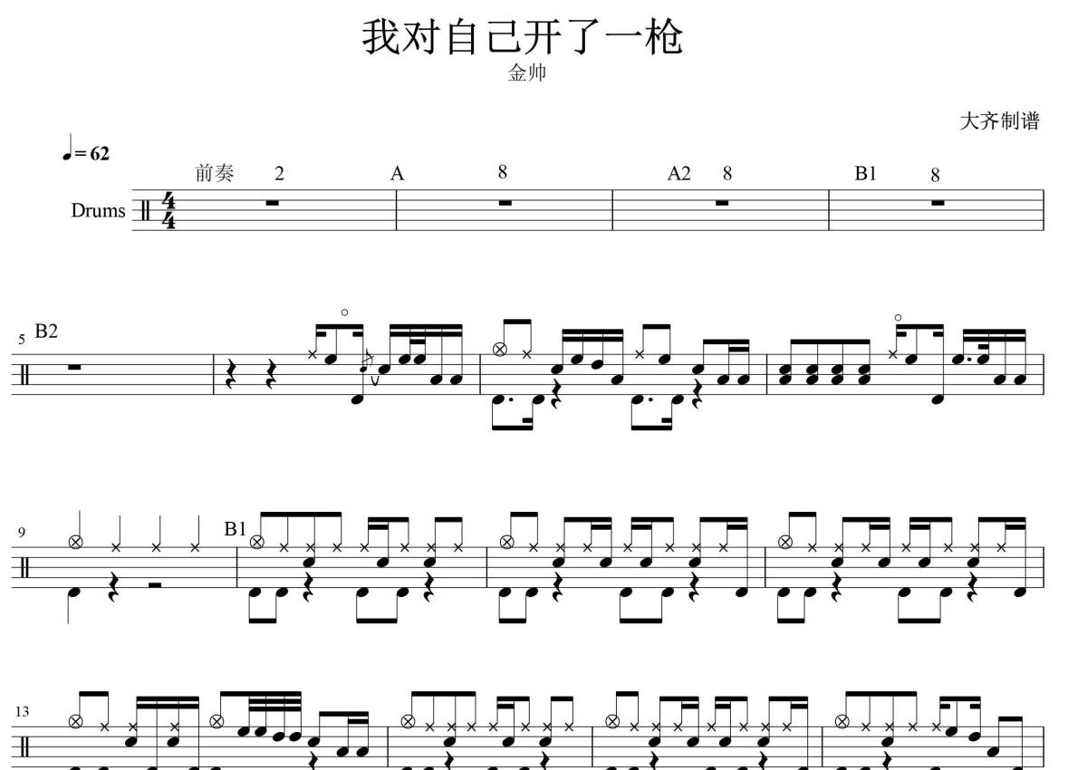 《我对自己开了一枪》是金帅演唱的一首歌曲,拍号为4/4拍,歌曲速度为每分钟62拍,这份鼓谱共有一张高清图谱,图谱由 @大齐 编配上传,图谱使用五线谱编配,使用这份我对自己开了一枪架子鼓谱,你将能够轻松地敲打出这首金帅的我对自己开了一枪,快来尝试吧。