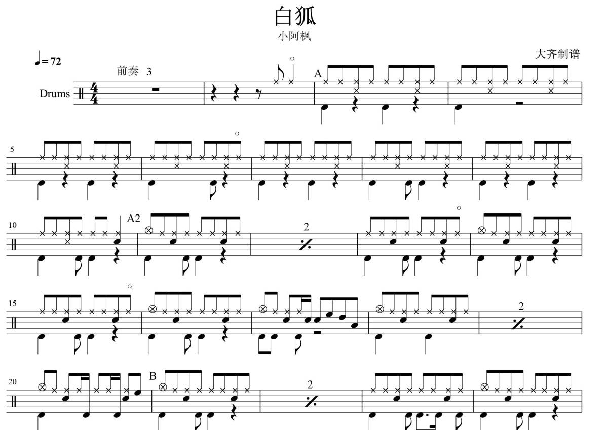小阿枫《白狐》鼓谱 - 架子鼓谱