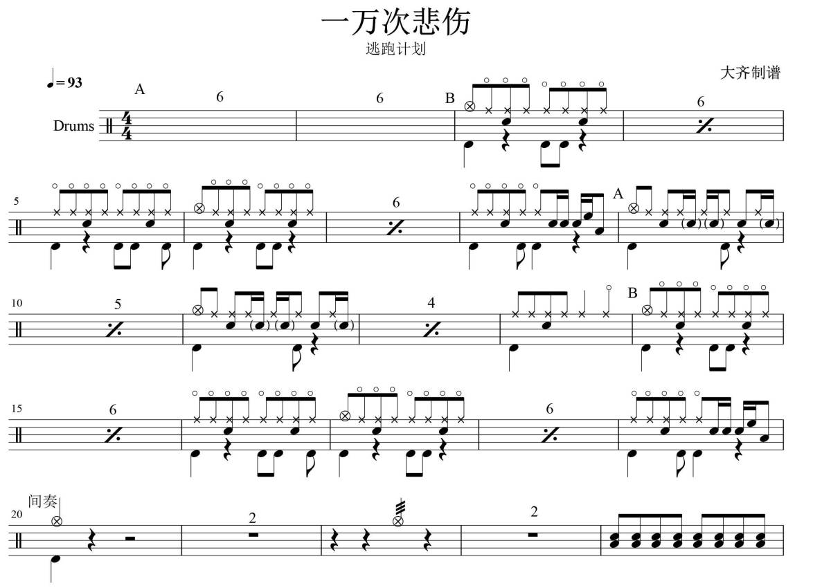 《一万次悲伤》是逃跑计划演唱的一首歌曲,拍号为4/4拍,歌曲速度为每分钟93拍,这份鼓谱共有一张高清图谱,图谱由 @大齐 编配上传,图谱使用五线谱编配,使用这份一万次悲伤架子鼓谱,你将能够轻松地敲打出这首逃跑计划的一万次悲伤,快来尝试吧。