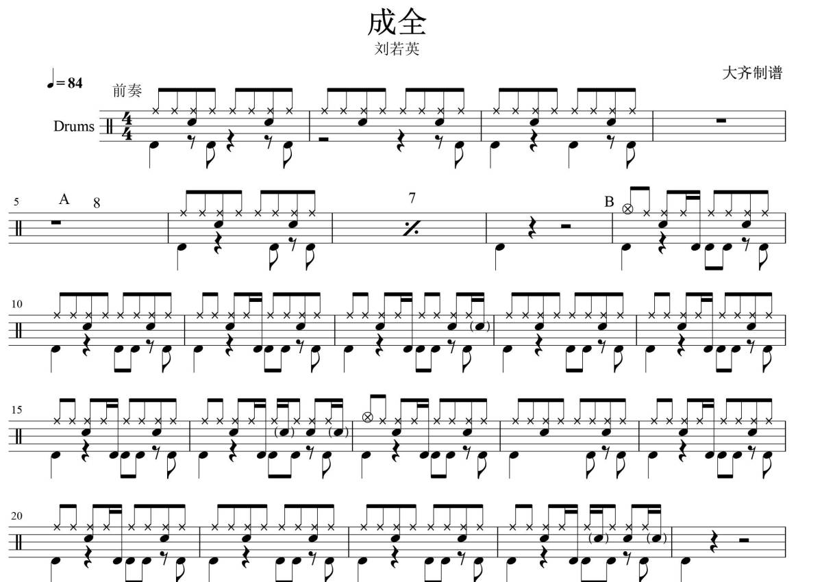 《成全》是刘若英演唱的一首歌曲,拍号为4/4拍,歌曲速度为每分钟84拍,这份鼓谱共有两张高清图谱,图谱由 @大齐 编配上传,图谱使用五线谱编配,使用这份成全架子鼓谱,你将能够轻松地敲打出这首刘若英的成全,快来尝试吧。