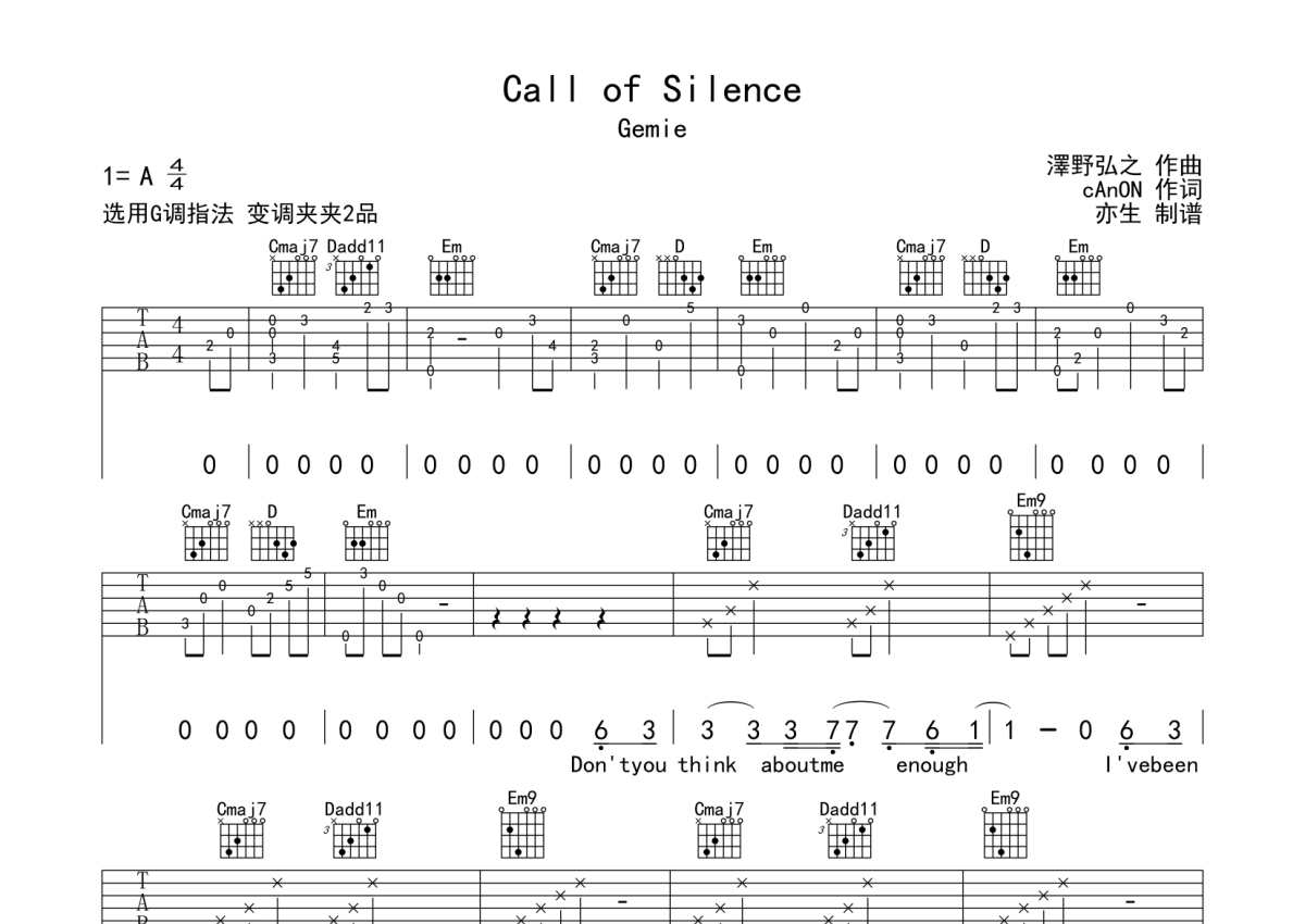 泽野弘之《Call of Silence》吉他谱 - G调弹唱六线谱