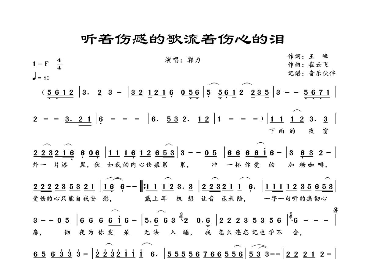 《听着伤感的歌流着伤心的泪》是郭力演唱的一首歌曲,拍号为4/4拍,这份简谱共有一张高清图谱,图谱由 @音乐伙伴 编配上传。