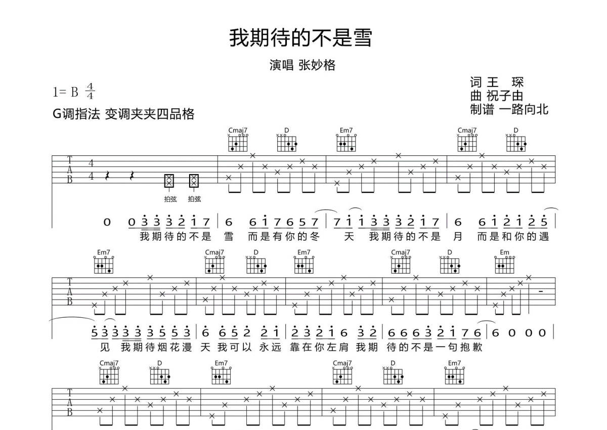 《我期待的不是雪》是任妙格演唱的一首歌曲,专辑版,拍号为4/4拍,歌曲原调为B调,但由于原调指法比较难,为了方便弹奏,本吉他谱采用的是G调指法编配,变调夹4品弹奏即为原调,当然也可以根据自己的音域改变变调夹位置,或者通过改变和弦调性,以方便自己弹奏,这份吉他谱共有两张高清图谱,图谱由 @圆创吉他谱 编配上传,图谱使用六线谱编配,包含吉他和弦指法、简谱以及歌词部分,曲谱配备了相关的音频提供试听,使用这份我期待的不是雪吉他谱,可以让你更加方便地掌握这首歌曲的弹唱技巧,快来尝试吧。