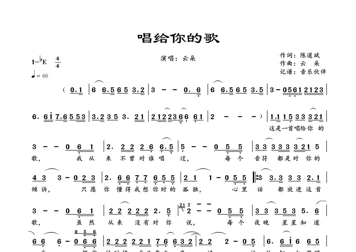 《唱给你的歌》是云朵演唱的一首歌曲,拍号为4/4拍,歌曲速度为每分钟66拍,这份简谱共有一张高清图谱,图谱由 @音乐伙伴 编配上传。