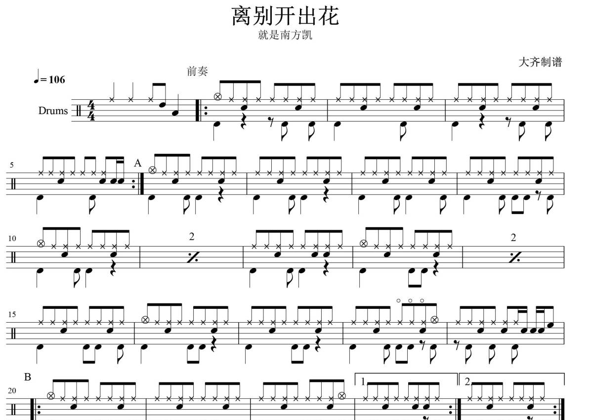 《离别开出花》是就是南方凯演唱的一首歌曲,拍号为4/4拍,歌曲速度为每分钟106拍,这份鼓谱共有两张高清图谱,图谱由 @大齐 编配上传,图谱使用五线谱编配,使用这份离别开出花架子鼓谱,你将能够轻松地敲打出这首就是南方凯的离别开出花,快来尝试吧。