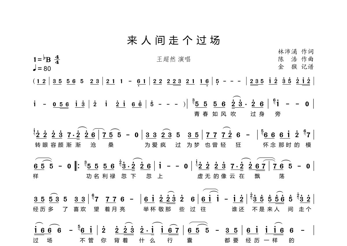 《来人间走个过场》是王超然演唱的一首歌曲,拍号为4/4拍,歌曲速度为每分钟80拍,这份简谱共有一张高清图谱,图谱由 @金猴奋起千钧棒 编配上传。