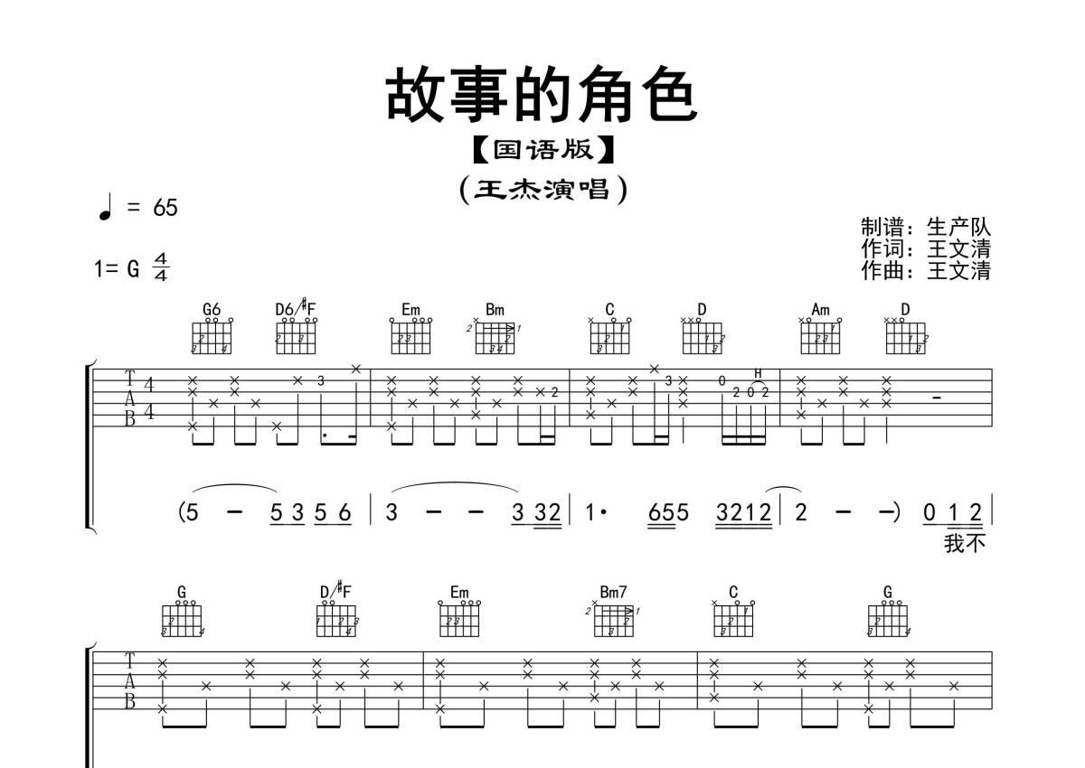 《故事的角色(国语版)》是王杰演唱的一首歌曲,精编完美版,拍号为4/4拍,歌曲速度为每分钟65拍,歌曲原调为G调,本吉他谱采用的是G调指法编配,演奏时不需要使用变调夹即为原调,这份吉他谱共有三张高清图谱,图谱由 @生产队 编配上传,图谱使用六线谱编配,包含吉他和弦指法、简谱以及歌词部分,使用这份故事的角色(国语版)吉他谱,可以让你更加方便地掌握这首歌曲的弹唱技巧,快来尝试吧。《故事的角色》是一首由王文清作词作曲、陈志远编曲、王杰演唱的歌曲,收录在王杰1987年首张国语专辑《一场游戏一场梦》中。本吉他谱根据原版G调指法编配,完整的前奏、间奏、尾奏编配,怀旧经典!。