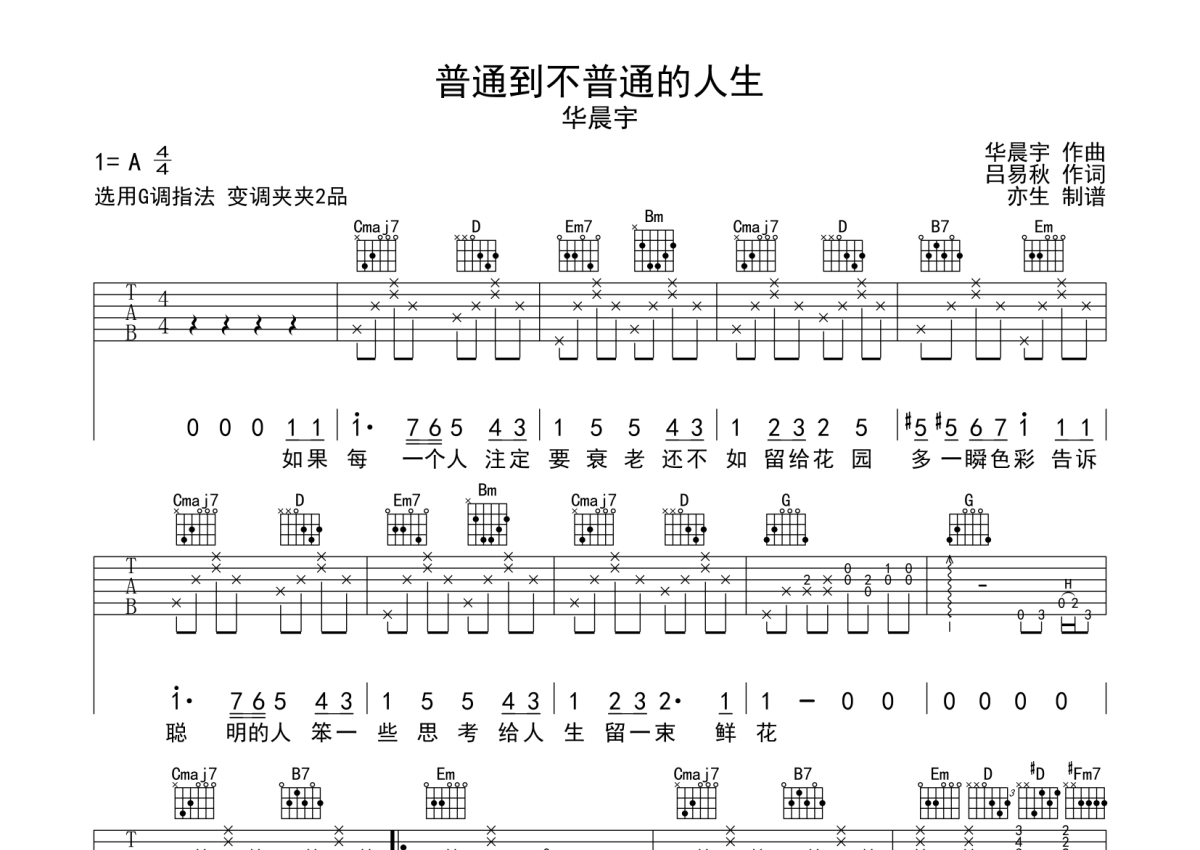 《普通到不普通的人生》是华晨宇演唱的一首歌曲,拍号为4/4拍,歌曲原调为G调,本吉他谱采用的是G调指法编配,变调夹2品弹奏即为原调,当然也可以根据自己的音域改变变调夹位置,或者通过改变和弦调性,以方便自己弹奏,这份吉他谱共有三张高清图谱,图谱由 @亦生 编配上传,图谱使用六线谱编配,包含吉他和弦指法、简谱以及歌词部分,使用这份普通到不普通的人生吉他谱,可以让你更加方便地掌握这首歌曲的弹唱技巧,快来尝试吧。