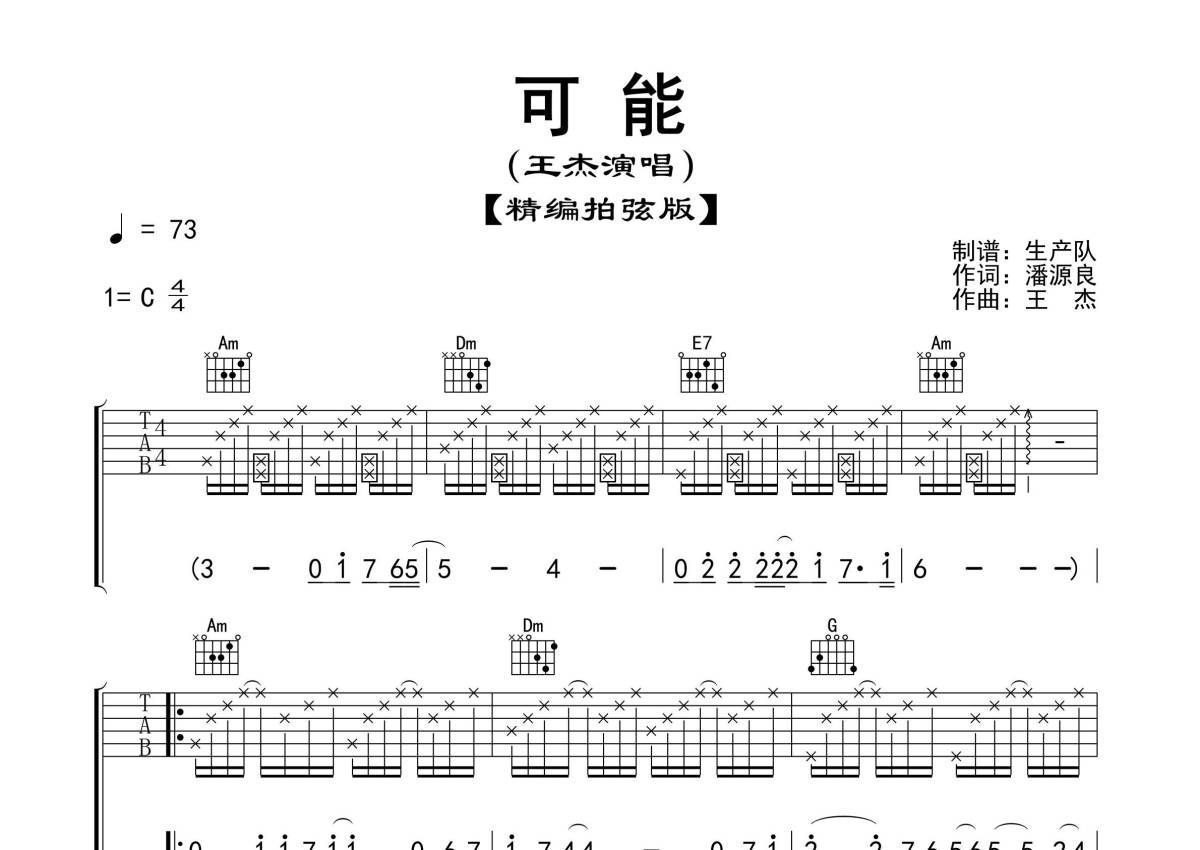 《可能》是王杰演唱的一首歌曲,精编拍弦版,拍号为4/4拍,歌曲速度为每分钟73拍,歌曲原调为C调,本吉他谱采用的是C调指法编配,演奏时不需要使用变调夹即为原调,这份吉他谱共有三张高清图谱,图谱由 @生产队 编配上传,图谱使用六线谱编配,包含吉他和弦指法、简谱以及歌词部分,使用这份可能吉他谱,可以让你更加方便地掌握这首歌曲的弹唱技巧,快来尝试吧。《可能》是一首由潘源良作词、王杰作曲,陈志远编曲,王杰演唱的歌曲,收录在王杰首张粤语专辑《故事的角色》中,《可能》是TVB电视剧《义不容情》的插曲。本吉他谱根据原版C调指法编配,完整的前奏、间奏和SOLO编配,精编拍弦版,怀旧经典!。