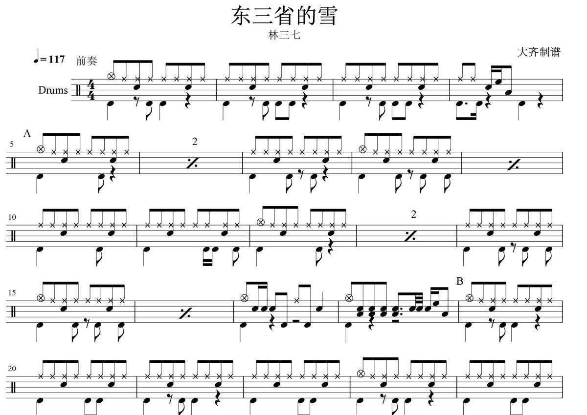 《东三省的雪》是林三七演唱的一首歌曲,拍号为4/4拍,歌曲速度为每分钟117拍,这份鼓谱共有两张高清图谱,图谱由 @大齐 编配上传,图谱使用五线谱编配,使用这份东三省的雪架子鼓谱,你将能够轻松地敲打出这首林三七的东三省的雪,快来尝试吧。
