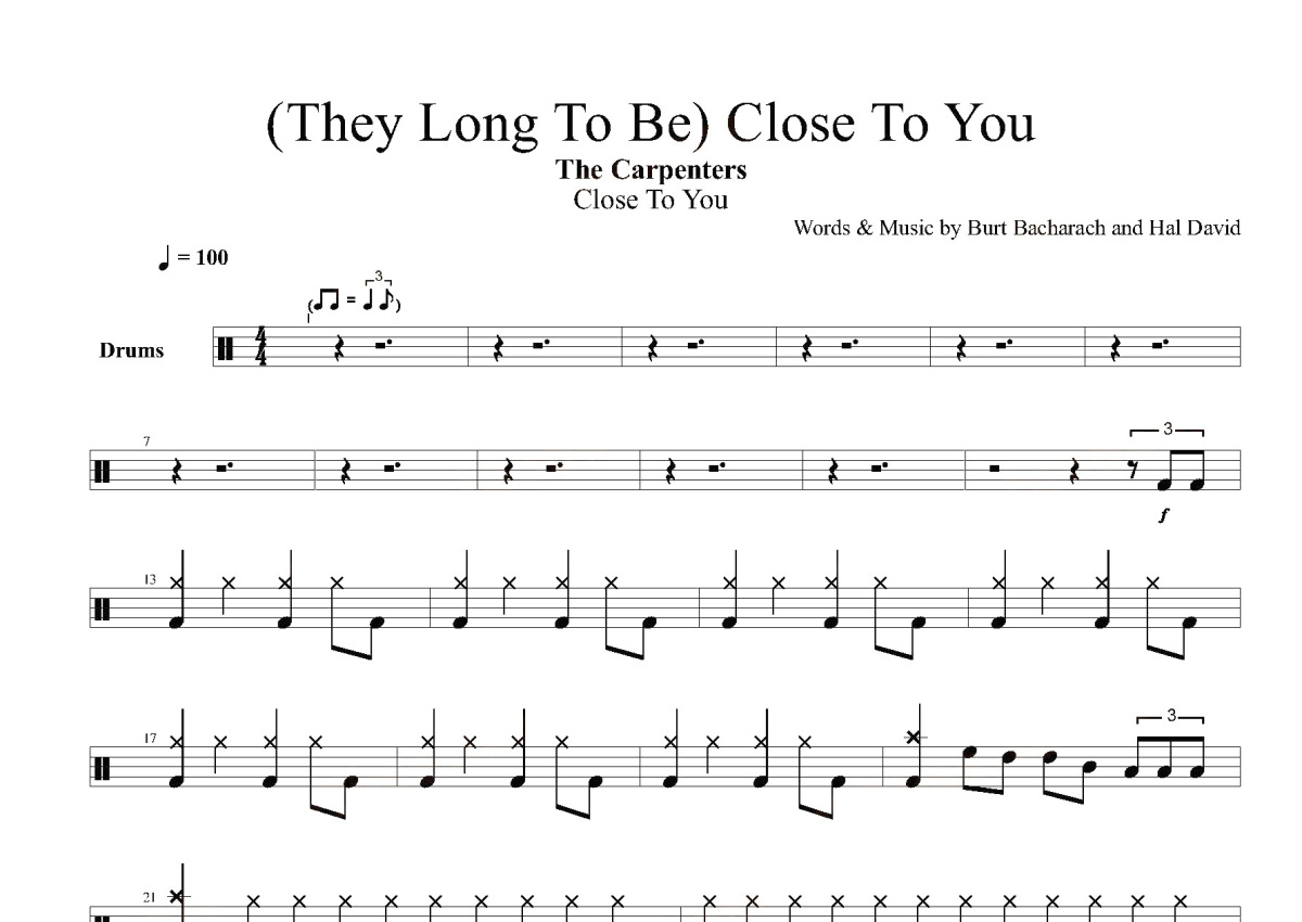 《They Long To Be》是Carpenters演唱的一首歌曲,这份鼓谱共有三张高清图谱,图谱由 @打鼓谱 编配上传,图谱使用五线谱编配,使用这份They Long To Be架子鼓谱,你将能够轻松地敲打出这首Carpenters的They Long To Be,快来尝试吧。《(They Long To Be) Close To You》所属专辑《The Very Best Of Perry Como》。卡朋特乐队(Carpenters),美国流行乐二人演唱组合,由理查德·卡朋特、卡伦·卡朋特兄妹组成。