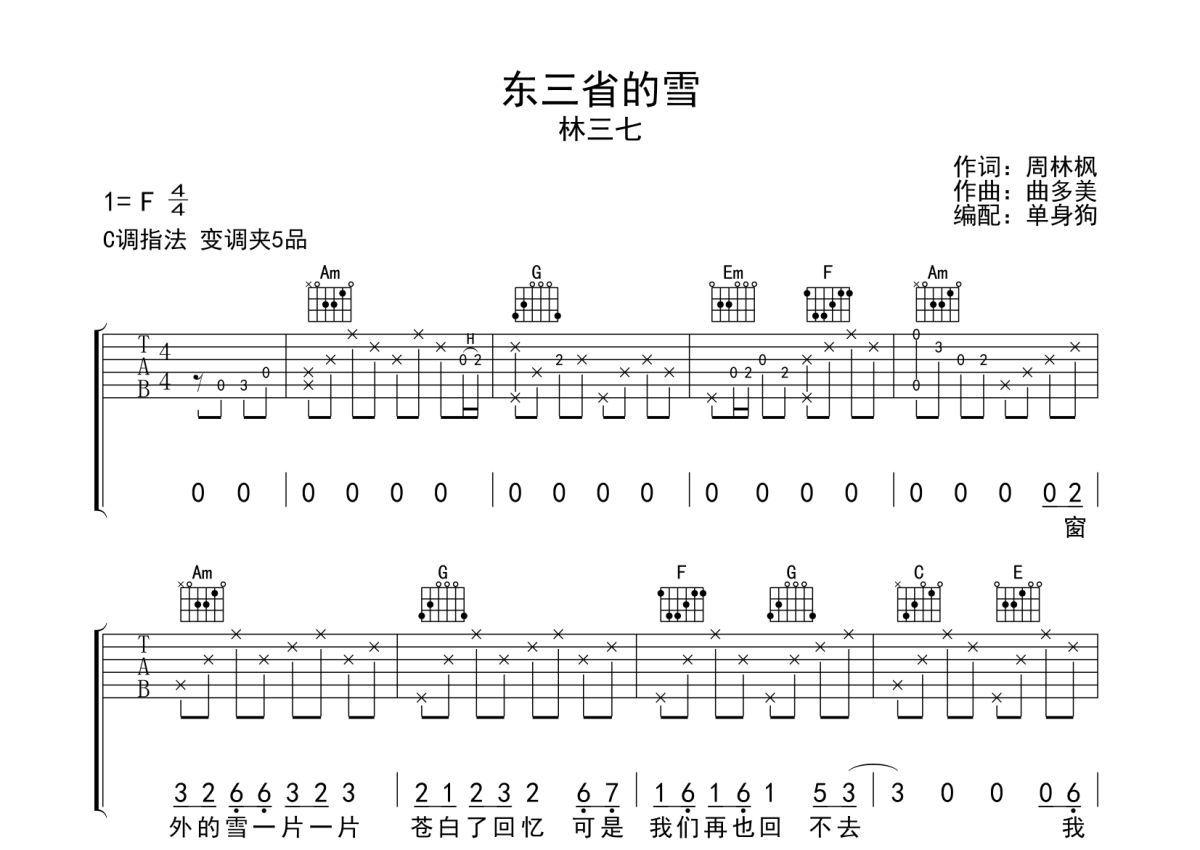 林三七《东三省的雪》吉他谱 - C调弹唱六线谱