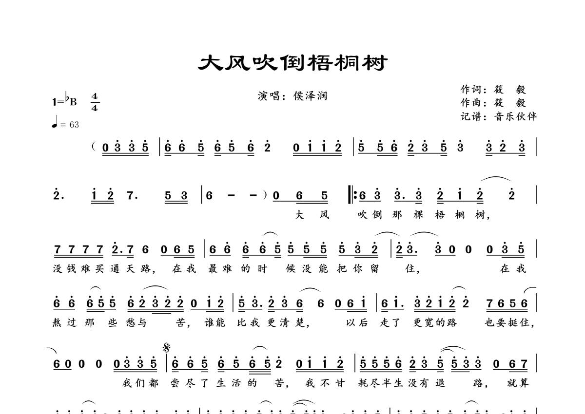 《大风吹倒梧桐树》是侯泽润演唱的一首歌曲,拍号为4/4拍,歌曲速度为每分钟63拍,这份简谱共有一张高清图谱,图谱由 @音乐伙伴 编配上传。