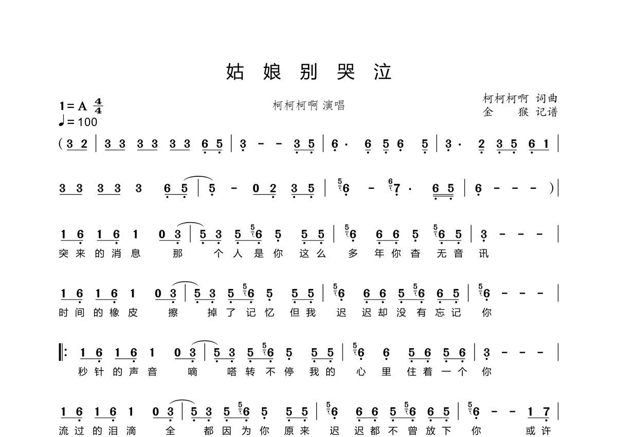 《姑娘别哭泣》是柯柯柯啊演唱的一首歌曲,拍号为4/4拍,歌曲速度为每分钟100拍,这份简谱共有两张高清图谱,图谱由 @金猴奋起千钧棒 编配上传。