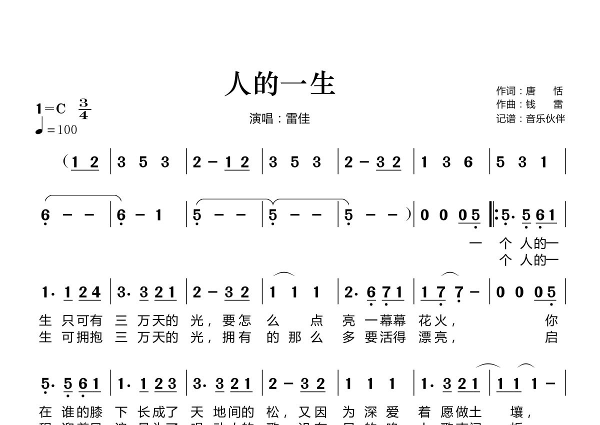 《人的一生》是雷佳演唱的一首歌曲,这份简谱共有两张高清图谱,图谱由 @音乐伙伴 编配上传。