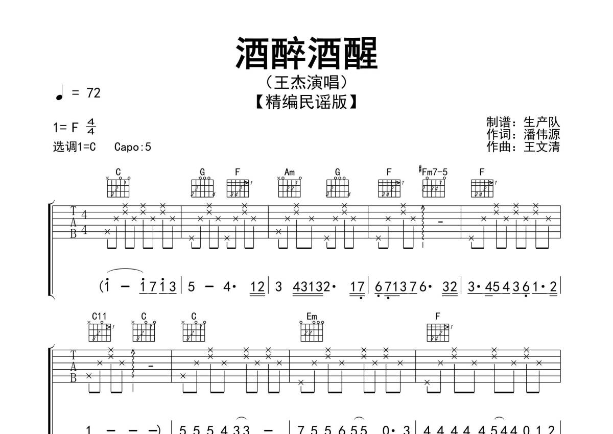 《酒醉酒醒》是王杰演唱的一首歌曲,精编民谣版,拍号为4/4拍,歌曲速度为每分钟72拍,歌曲原调为F调,但由于原调指法比较难,为了方便弹奏,本吉他谱采用的是C调指法编配,变调夹5品弹奏即为原调,当然也可以根据自己的音域改变变调夹位置,或者通过改变和弦调性,以方便自己弹奏,这份吉他谱共有三张高清图谱,图谱由 @生产队 编配上传,图谱使用六线谱编配,包含吉他和弦指法、简谱以及歌词部分,使用这份酒醉酒醒吉他谱,可以让你更加方便地掌握这首歌曲的弹唱技巧,快来尝试吧。《酒醉酒醒》是王杰演唱的一首歌曲,由台湾著名音乐人王文清作曲,香港著名填词人潘伟源作词,陈志远编曲,收录在《故事的角色》专辑。本吉他谱根据采用C调指法编配的适合吉他弹唱的民谣版,完整的前奏、间奏,怀旧粤语经典歌曲!。