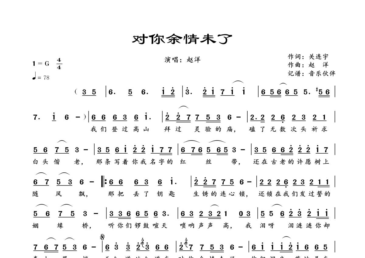 《对你余情未了》是赵洋演唱的一首歌曲,拍号为4/4拍,歌曲速度为每分钟78拍,这份简谱共有一张高清图谱,图谱由 @音乐伙伴 编配上传。