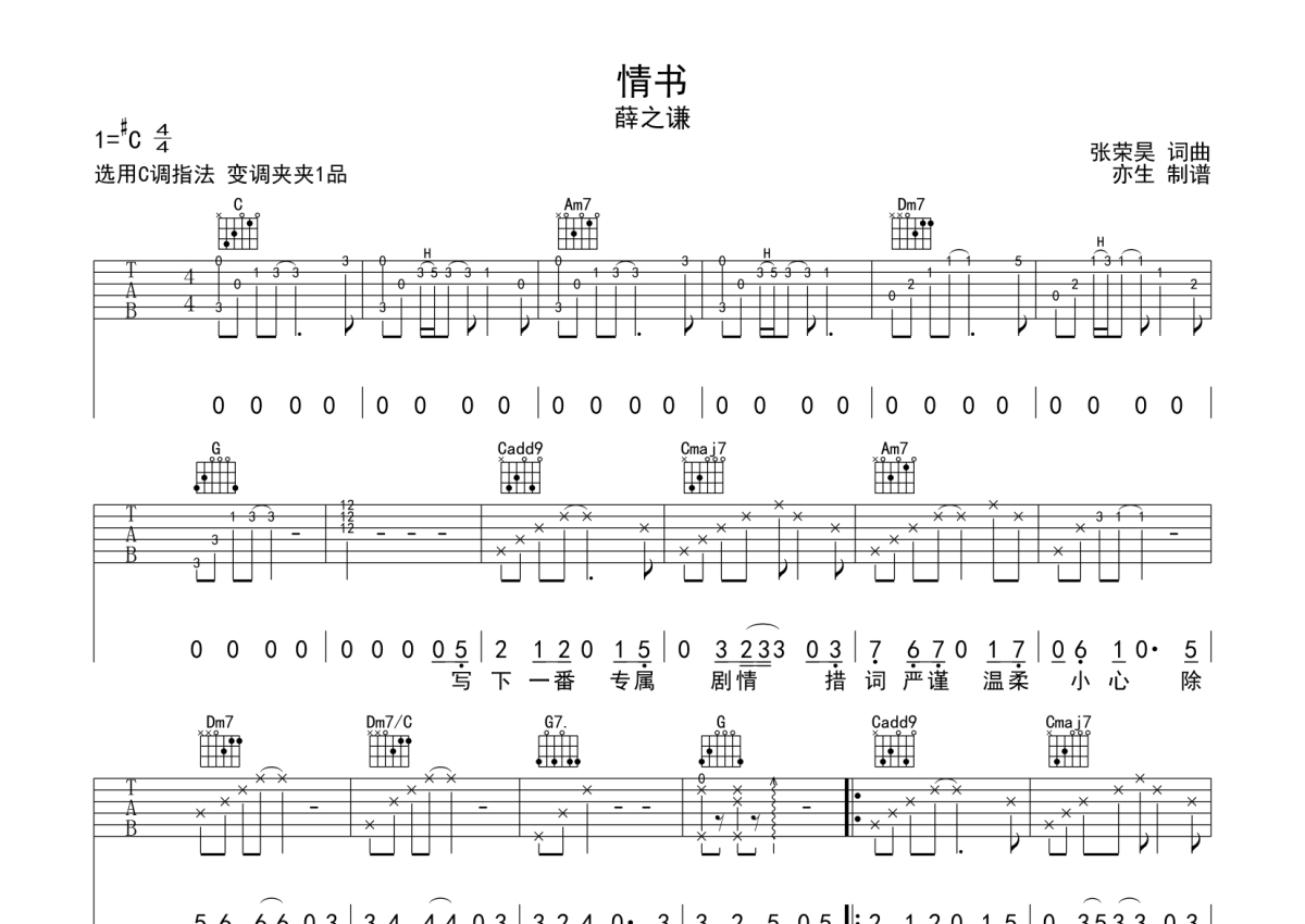 薛之谦《情书》吉他谱 - C调弹唱六线谱