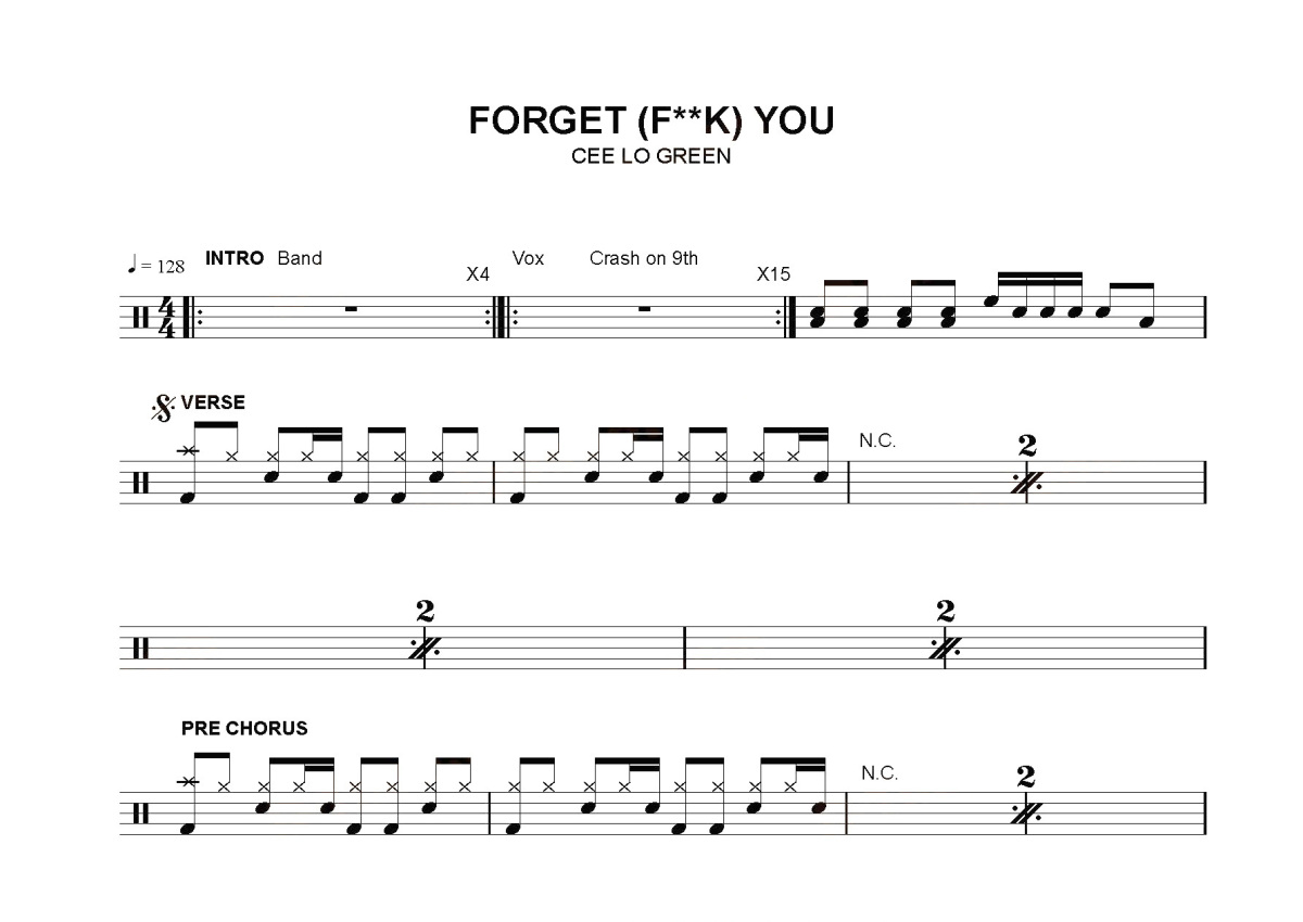 《Forget You》是cee lo green演唱的一首歌曲,这份鼓谱共有两张高清图谱,图谱由 @打鼓谱 编配上传,图谱使用五线谱编配,使用这份Forget You架子鼓谱,你将能够轻松地敲打出这首cee lo green的Forget You,快来尝试吧。《Forget You》原唱歌手是Cee-Lo Green(科罗-格林),发型日期2014-04-04,所属专辑《Forget you》,原名《Fuck you》。与莉莉·艾伦有同名歌曲。Cee-Lo Green来自美国著名的老牌hip-hop团体Goodie Mob,同时他也是一位颇为活跃的solo艺人,在很多大牌hip-hop艺人的唱片中都可以看到他的身影,去年由他操刀制作的热门单曲"Don't Cha"更是风靡了全世界。2010年,他加入美国歌唱类真人秀《美国之声》,成为常驻评委。