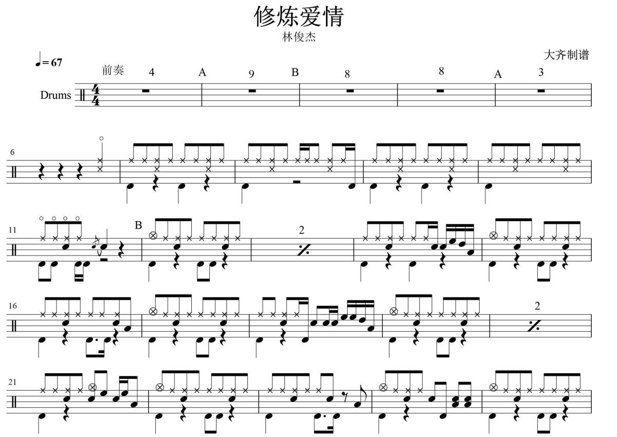 《修炼爱情》是林俊杰演唱的一首歌曲,拍号为4/4拍,歌曲速度为每分钟67拍,这份鼓谱共有一张高清图谱,图谱由 @大齐 编配上传,图谱使用五线谱编配,使用这份修炼爱情架子鼓谱,你将能够轻松地敲打出这首林俊杰的修炼爱情,快来尝试吧。
