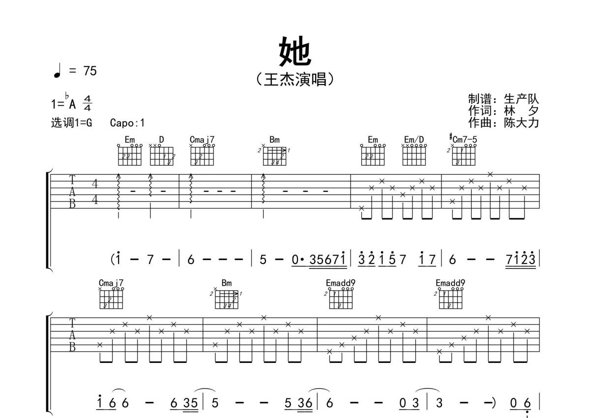 《她》是王杰演唱的一首歌曲,精编民谣版,拍号为4/4拍,歌曲速度为每分钟75拍,歌曲原调为Ab调,但由于原调指法比较难,为了方便弹奏,本吉他谱采用的是G调指法编配,变调夹1品弹奏即为原调,当然也可以根据自己的音域改变变调夹位置,或者通过改变和弦调性,以方便自己弹奏,这份吉他谱共有三张高清图谱,图谱由 @生产队 编配上传,图谱使用六线谱编配,包含吉他和弦指法、简谱以及歌词部分,使用这份她吉他谱,可以让你更加方便地掌握这首歌曲的弹唱技巧,快来尝试吧。《她》是一首王杰演唱的歌曲,由林夕作词,由陈大力、陈秀男作曲,Ricky Ho编曲,收录在同名粤语专辑《她》中。本吉他谱根据原版G调指法编配,完整的前奏、间奏、尾奏和solo编配,怀旧经典!。