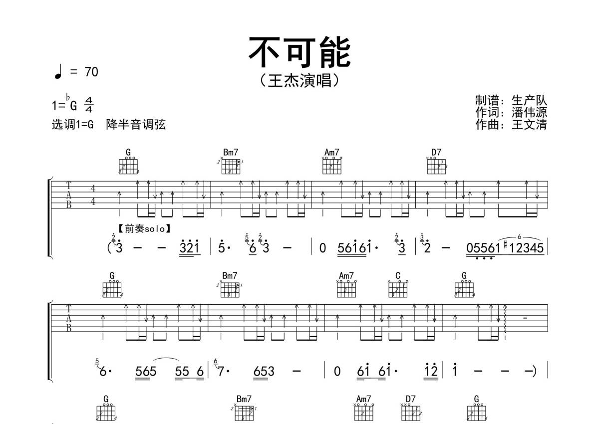 《不可能》是王杰演唱的一首歌曲,精编完美版,拍号为4/4拍,歌曲速度为每分钟70拍,歌曲原调为Gb调,但由于原调指法比较难,为了方便弹奏,本吉他谱采用的是G调指法编配,降半音调弦弹奏即为原调,当然也可以根据自己的音域决定是否调弦,这份吉他谱共有三张高清图谱,图谱由 @生产队 编配上传,图谱使用六线谱编配,包含吉他和弦指法、简谱以及歌词部分,使用这份不可能吉他谱,可以让你更加方便地掌握这首歌曲的弹唱技巧,快来尝试吧。《不可能》是一首由潘源良作词、王文清作曲,陈志远编曲,王杰演唱的粤语歌曲,收录在王杰首张粤语专辑《故事的角色》中。本吉他谱根据原版G调指法编配,完整的前奏、间奏及SOLO,扫弦节奏编配,怀旧经典!。