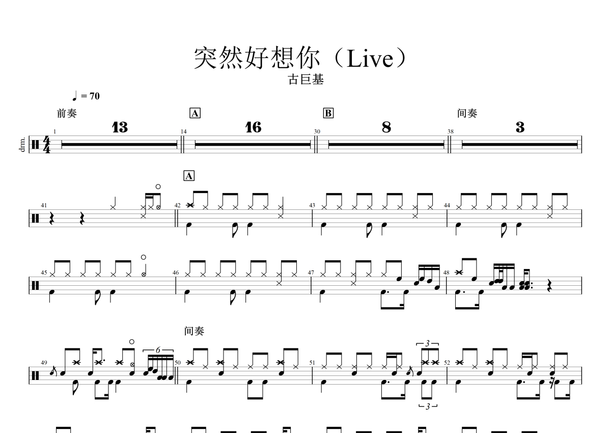 《突然好想你》是古巨基演唱的一首歌曲,(Live),拍号为4/4拍,歌曲速度为每分钟70拍,这份鼓谱共有一张高清图谱,图谱由 @打鼓老被骂 编配上传,图谱使用五线谱编配,使用这份突然好想你架子鼓谱,你将能够轻松地敲打出这首古巨基的突然好想你,快来尝试吧。