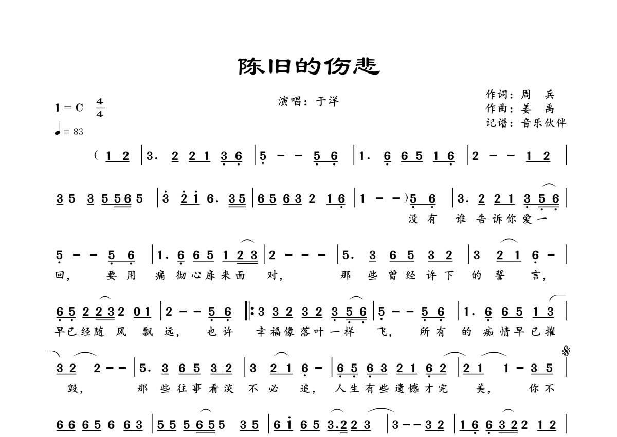 《陈旧的伤悲》是于洋演唱的一首歌曲,拍号为4/4拍,歌曲速度为每分钟83拍,这份简谱共有一张高清图谱,图谱由 @音乐伙伴 编配上传。