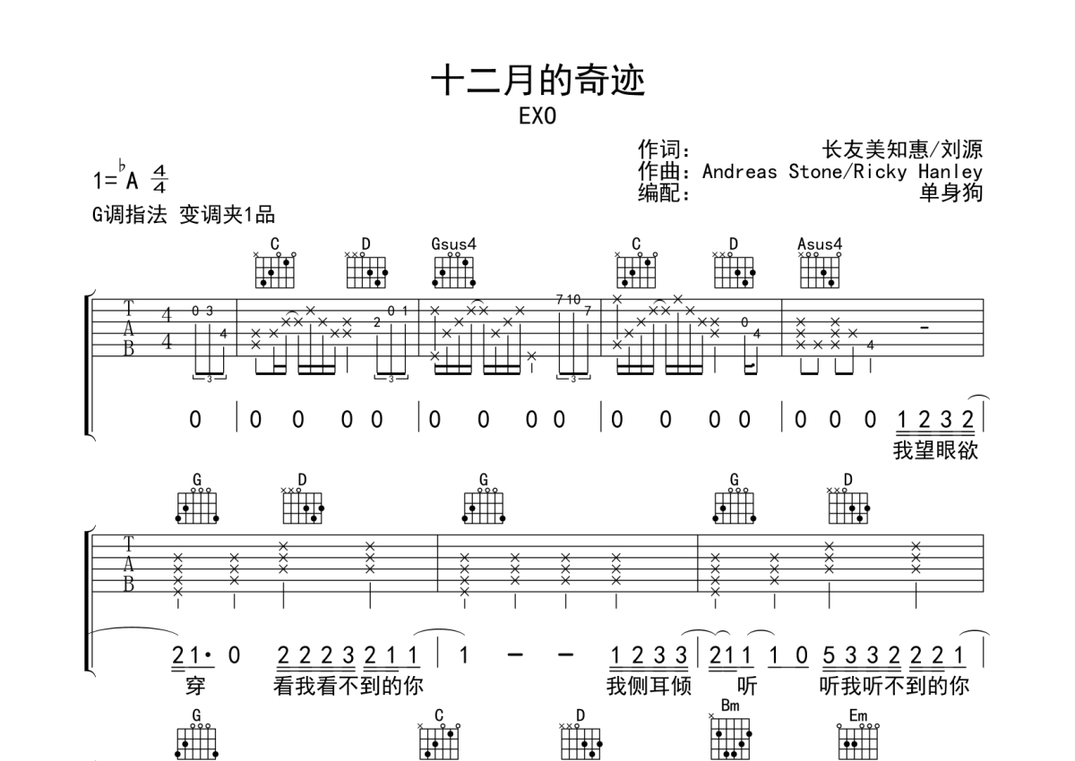 《十二月的奇迹》是EXO演唱的一首歌曲,拍号为4/4拍,歌曲原调为Ab调,但由于原调指法比较难,为了方便弹奏,本吉他谱采用的是G调指法编配,变调夹1品弹奏即为原调,当然也可以根据自己的音域改变变调夹位置,或者通过改变和弦调性,以方便自己弹奏,这份吉他谱共有四张高清图谱,图谱由 @单身狗 编配上传,图谱使用六线谱编配,包含吉他和弦指法、简谱以及歌词部分,使用这份十二月的奇迹吉他谱,可以让你更加方便地掌握这首歌曲的弹唱技巧,快来尝试吧。
