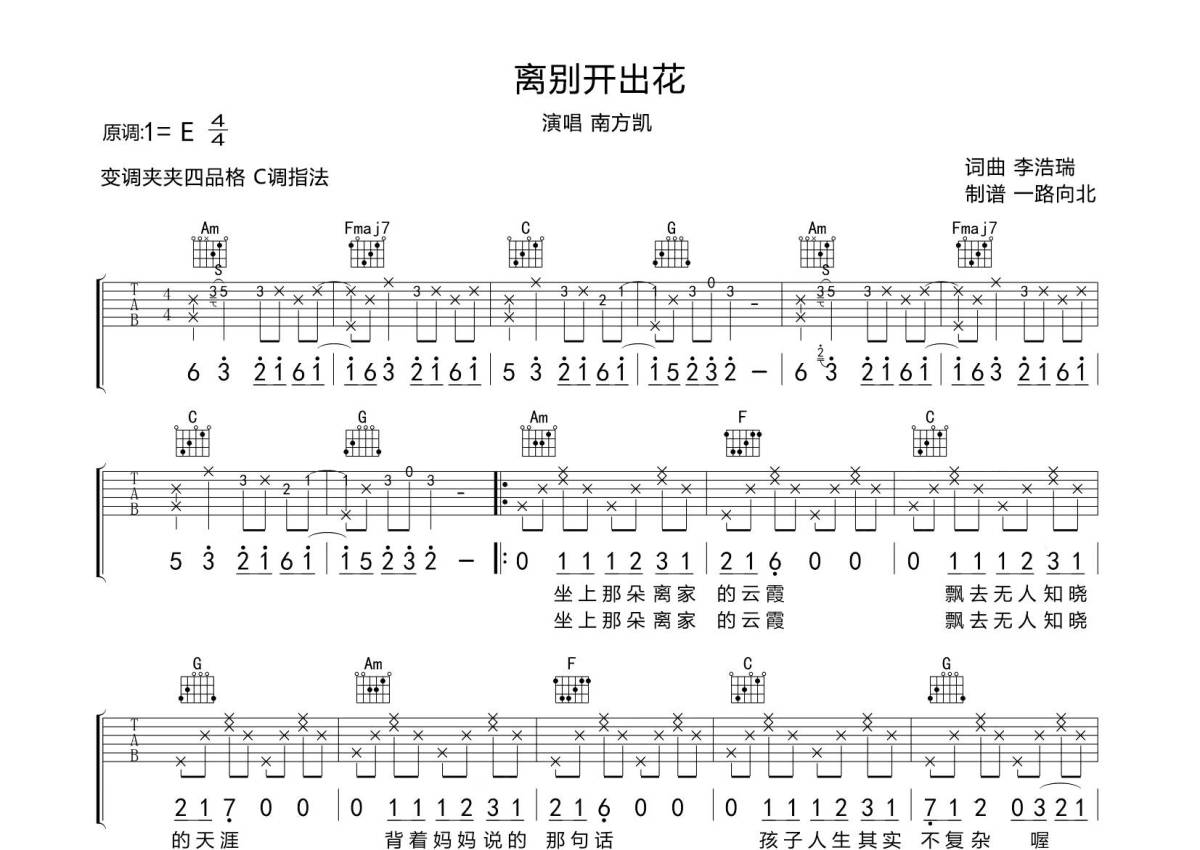 南方凯《离别开出花》吉他谱 - C调弹唱六线谱 - 专辑版