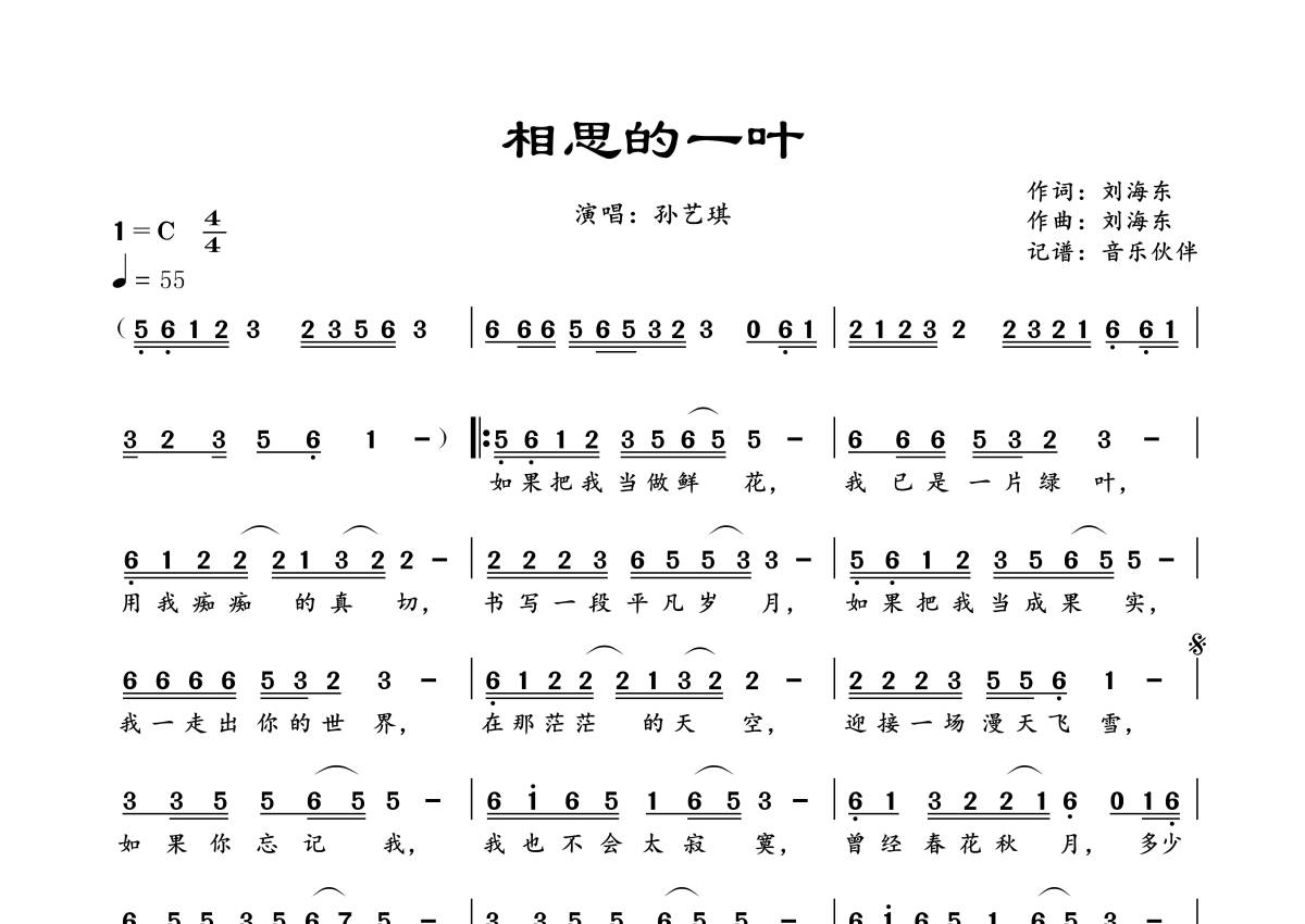 《相思的一叶》是孙艺琪演唱的一首歌曲,拍号为4/4拍,歌曲速度为每分钟55拍,这份简谱共有一张高清图谱,图谱由 @音乐伙伴 编配上传。